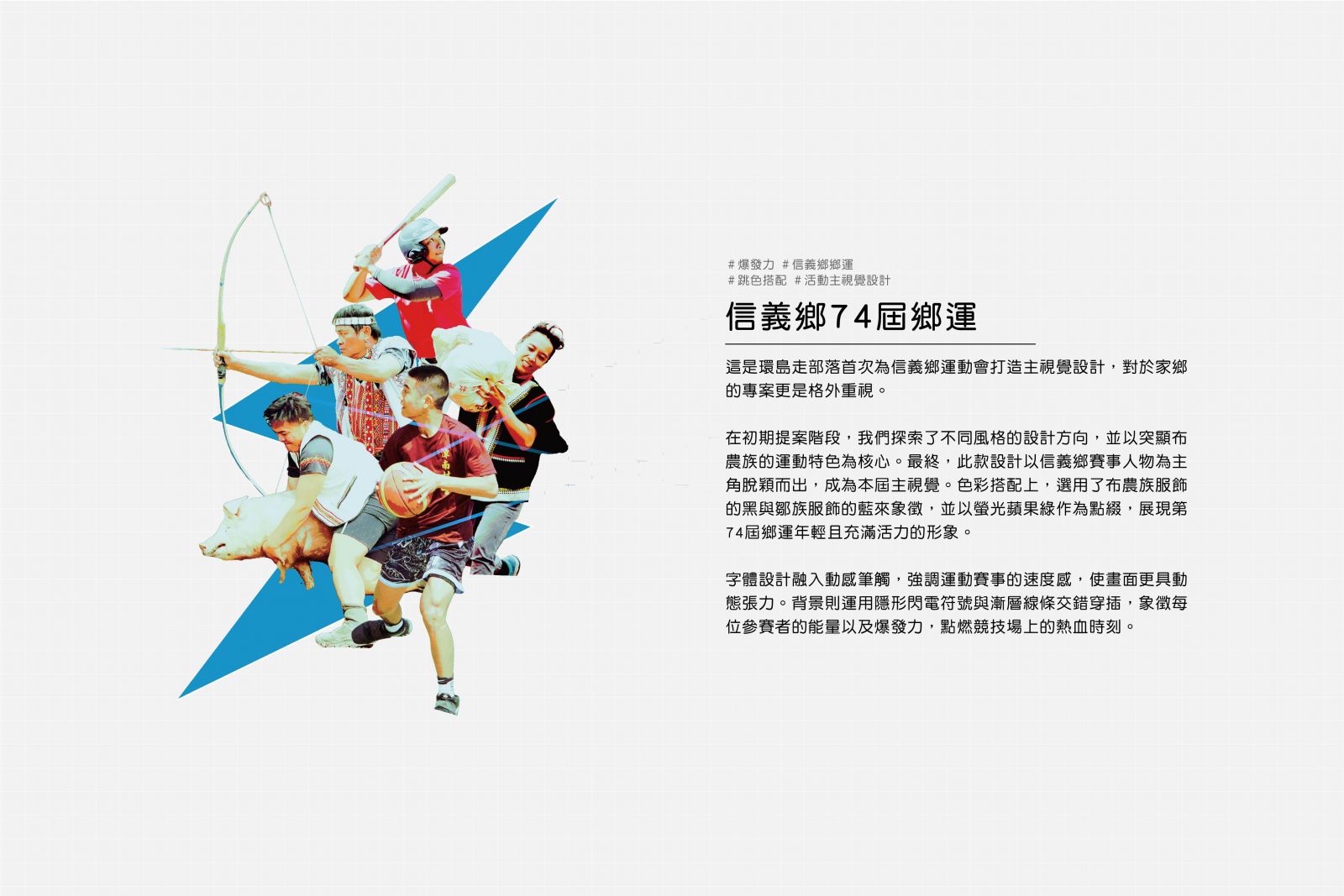 透過設計展現了信義鄉的運動精神,也在視覺語言上傳遞地方文化與競技的結合,打造專屬於第74屆鄉運的獨特風貌!